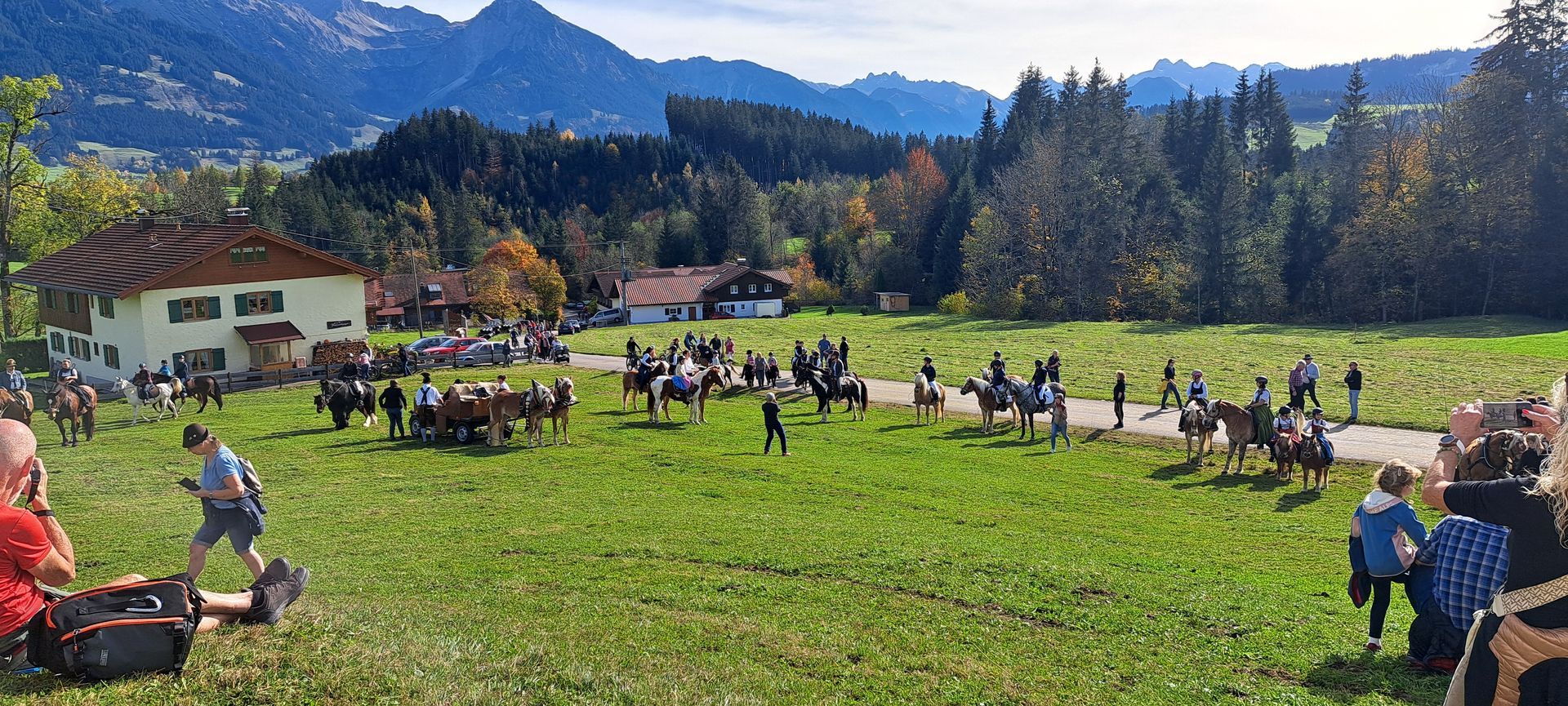 Wunderschönes Herbstwetter, lauter gut gelaunte HelferInnen, Gäste/Zuschauer und gut aufgelegte Musikanten erwarteten den wunderschönen Zug mit schön geschmückten Pferden vor Kutschen und unter Reitern. Vielen Dank an unseren Geistlichen, Pater Shijo, der die Andacht mit Pferdesegnung in Untermühlegg hielt, unseren Bürgermeister, Rolf Walter, der genau die richtigen Worte zur Begrüßung, Einführung und Erklärung fand, und auch an den Veranstalter, den Haflinger Reit- und Fahrverein Fischen e.V., ohne den wir diese schöne Veranstaltung nicht hätten! Ein großes Danke auch an die vielen fleißigen Hände, die Kuchen- und Kaffee-Spender und natürlich an unsere Gäste, die den angebotenen Kaffee und Kuchen großzügig honorierten!!! Jeder Euro kommt dem Erhalt der Kapelle zugute (momentan die Neugestaltung - barrierefrei - des Außenbereichs!) Musikalisch wurden wir dieses Jahr von der Blaskapelle Fischen begleitet, auch hierfür Danke!